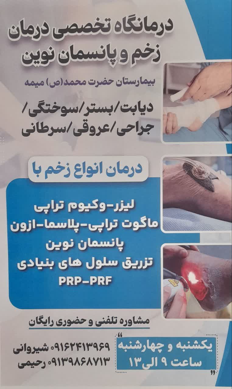 در راستای ارتقای سطح خدمات درمانی، افزایش رفاه شهروندان و تسهیل دسترسی بیماران به خدمات تخصصی، درمانگاه تخصصی درمان زخم و پانسمان نوین در بیمارستان حضرت محمد (ص) میمه فعال میباشد.